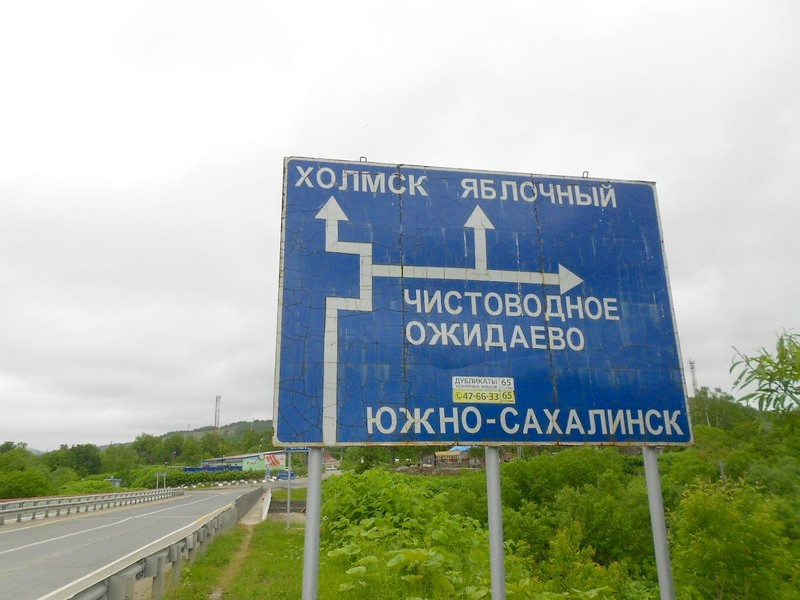 Прямо - Ноглики, налево - Холмск. Время 14:25.