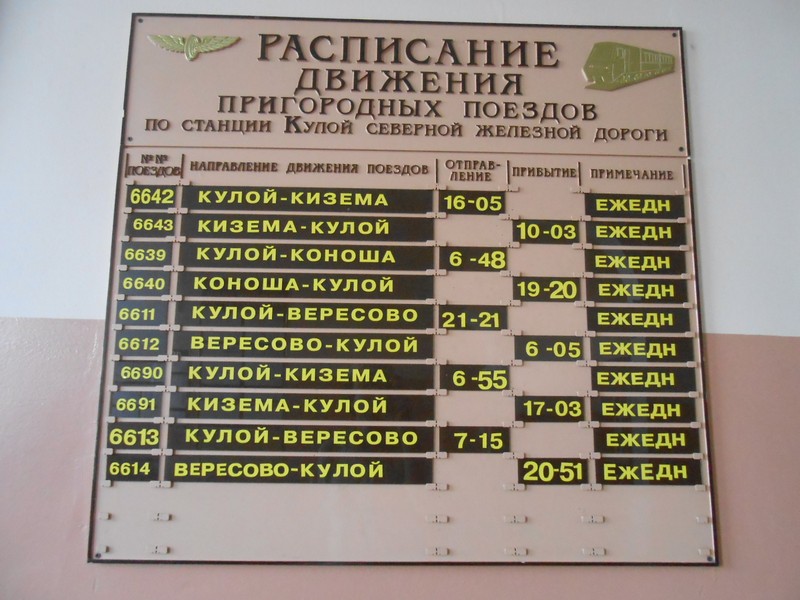 Такой же одновагонный поезд Кулой — Коноша, следующий через Юру. Прибывает в северный парк станции Вересово, тогда как поезд Кулой — Вересово через Келареву Горку — в южный парк.