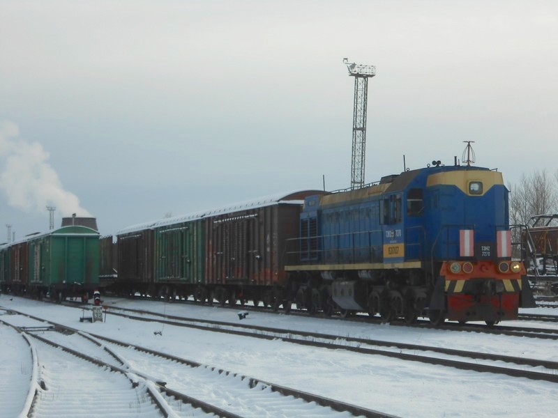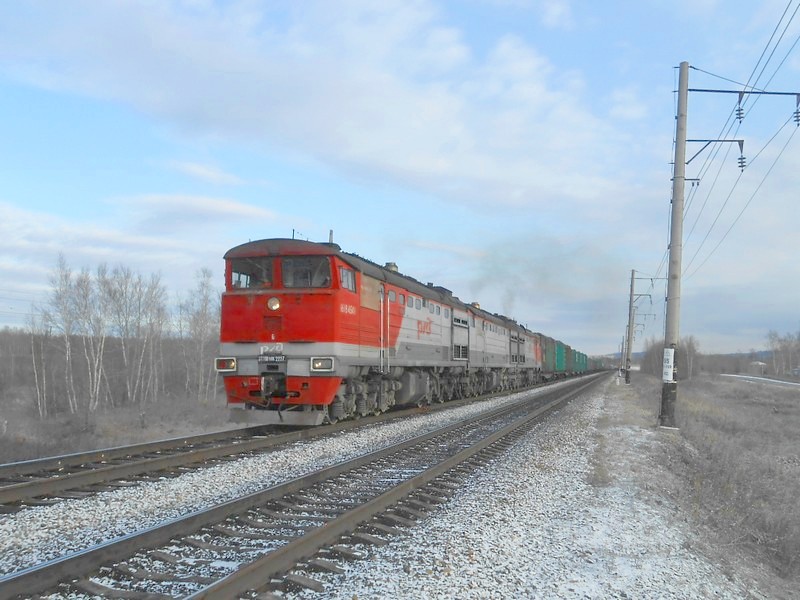 Грузовой поезд следует в сторону Волочаевки.