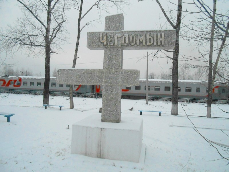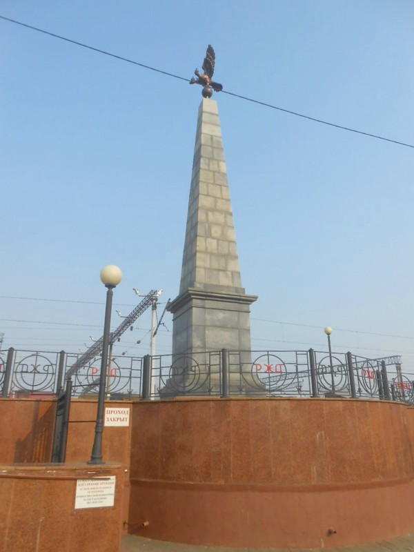 Чегдомын. Символическая бетонная стела у вокзала. Долгое время это был конечный пункт длинной тупиковой ветви