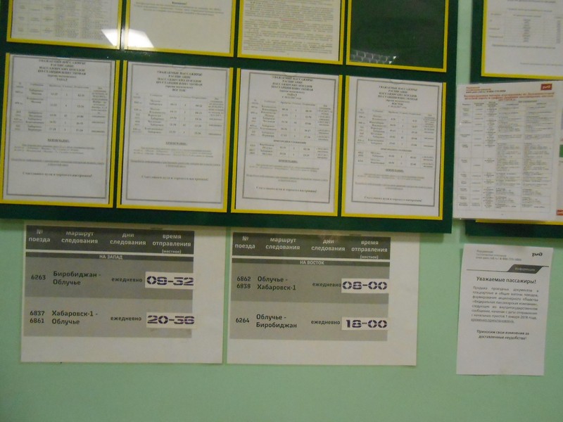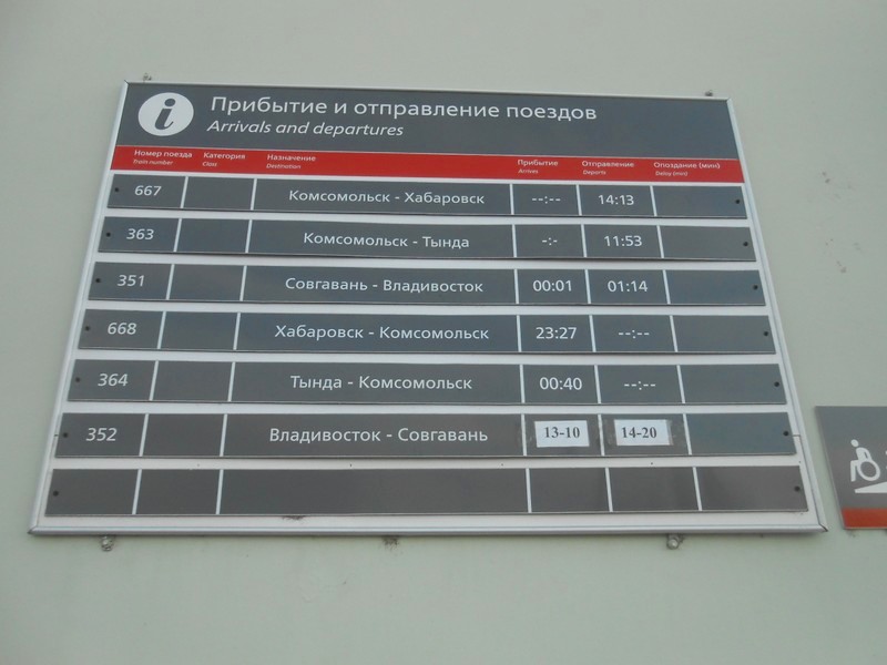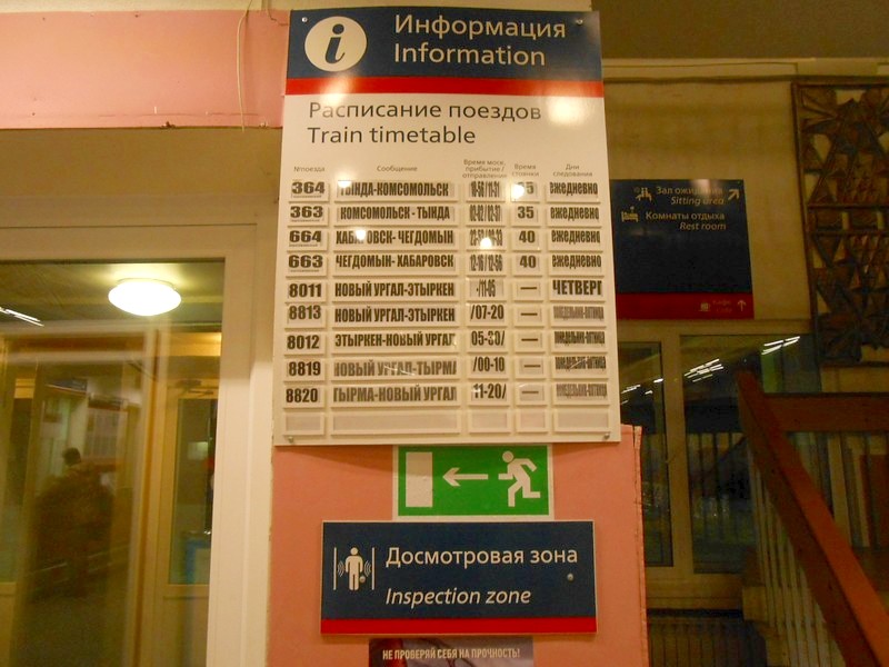 Расписание движения поездов на вокзале Новый Ургал. Очень редкий случай: здесь представлены и «рабочие» поезда.