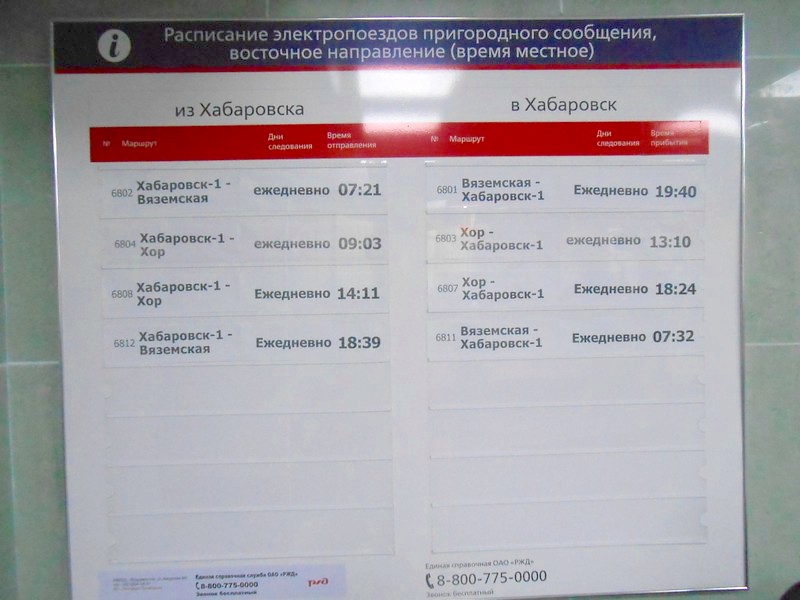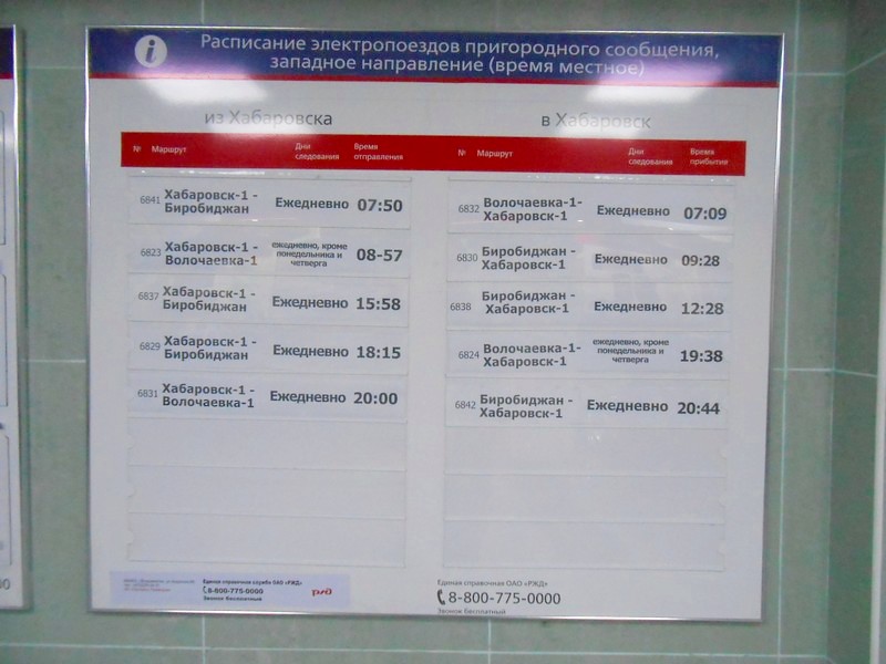 Расписание движения пригородных поездов от Хабаровска на запад. Один из трёх поездов на Биробиджан