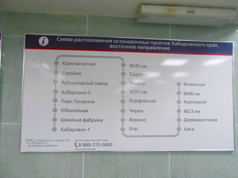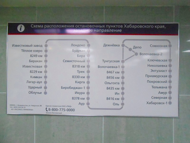 Станция Хабаровск I находится на 8522 километре, отсчёт от Москвы-Ярославской через Данилов и Тюмень. Движение пригородных поездов на запад — до Облучья, 8189 км, то есть на 333 километра — одна двадцатьпятая часть пути до Москвы. Дальше существуют пригородные поезда Облучье — Архара, ещё на 110 километров. Вероятнее всего, это не электропоезд, а электровоз с одним пассажирским вагоном.