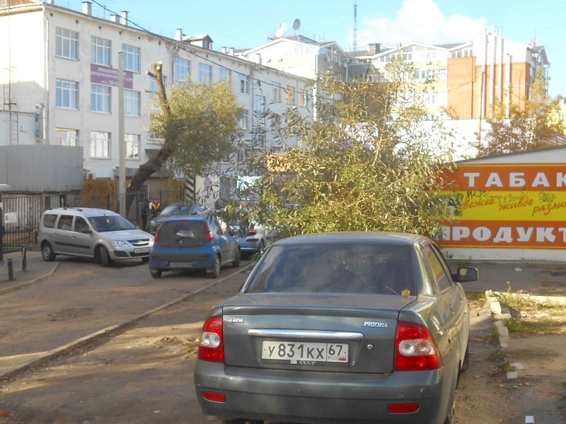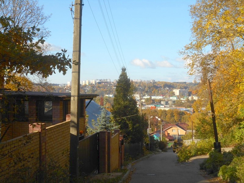 Смоленск. Движение по тихой улице вниз, в сторону реки Днепр, за которой - вокзал.