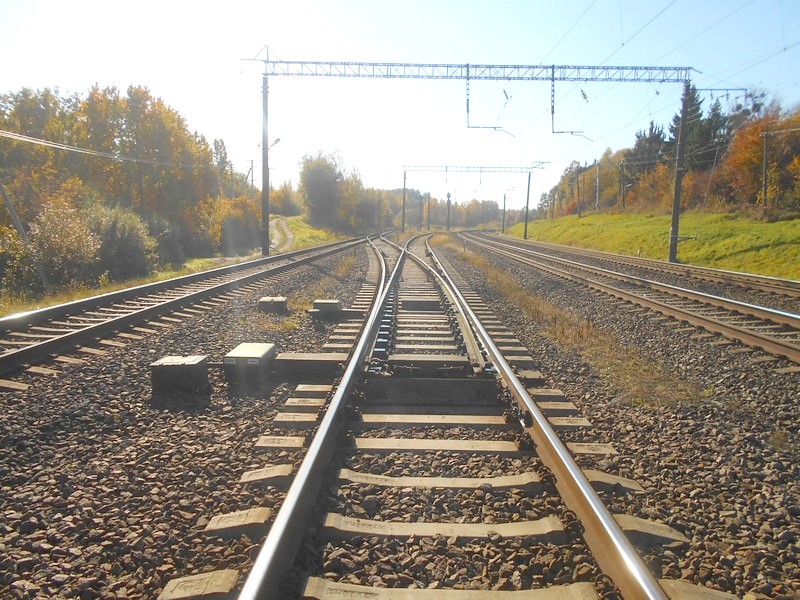 Направо - двухпутная линия к вокзалу Каунас, налево - однопутный обход через плотину, главный путь "калининградского транзита".