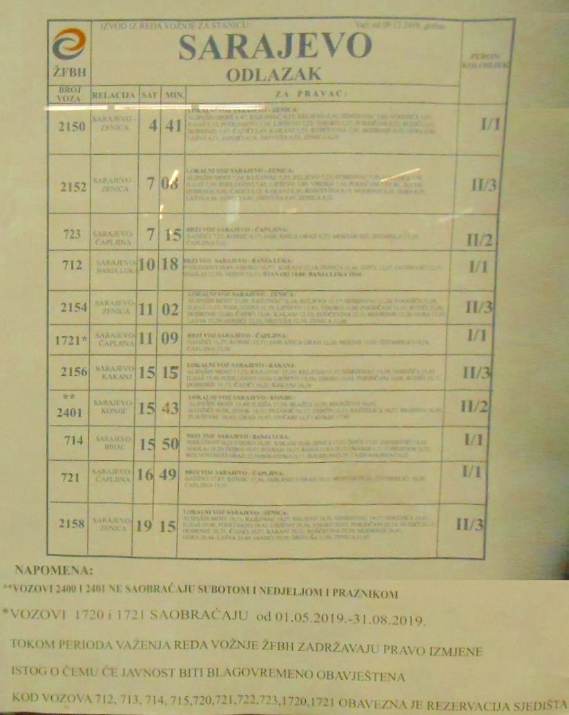 Железная дорога в Боснии и Герцеговине по конфигурации очень простая. Одна-единственная линия от пограничной станции Добрильин до пограничной станции Чапльина, обе станции - на границе с Хорватией. На линии - крупные города Баня-Лука и Сараево. При этом собственно станция Сараево находится в тупике, в стороне от главного хода.