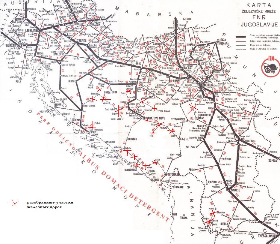 Схема железных дорог Югославии, начало 1960-х годов. Потери относительно нашего времени - огромные. Но это связано