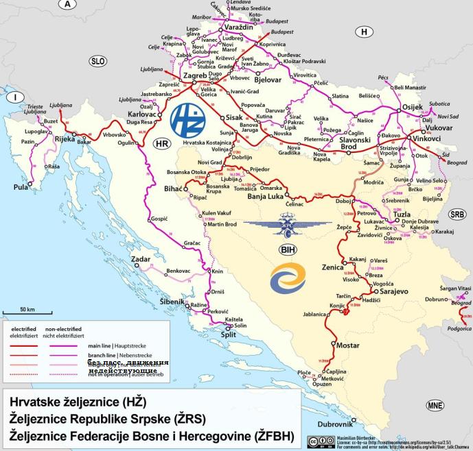 Схема железных дорог Хорватии и Боснии.