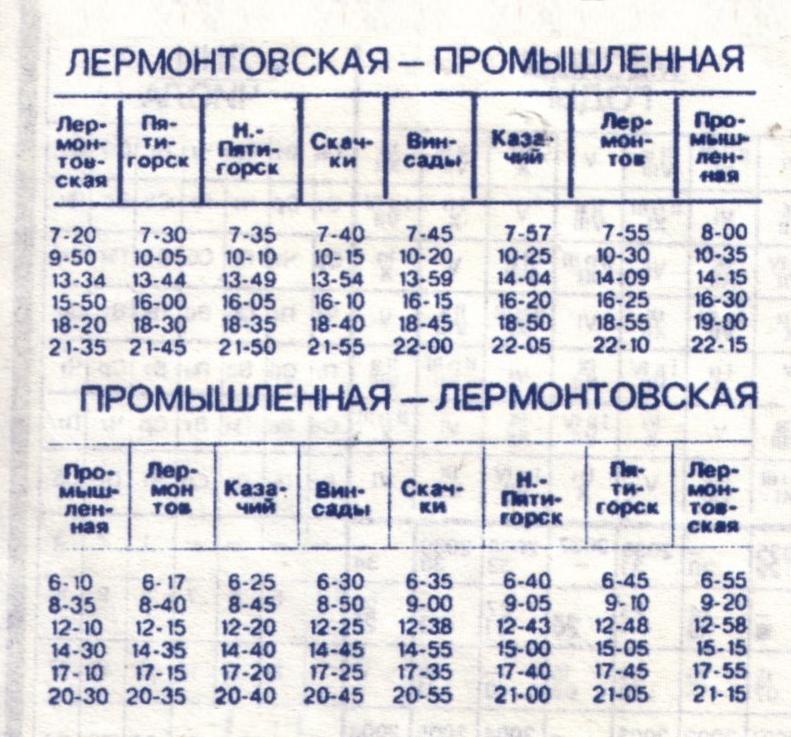 расписание движения поездов по маршруту Лермонтовская — Пятигорск — Скачки — Лермонтов — Промышленная с 28 мая 1995 года
