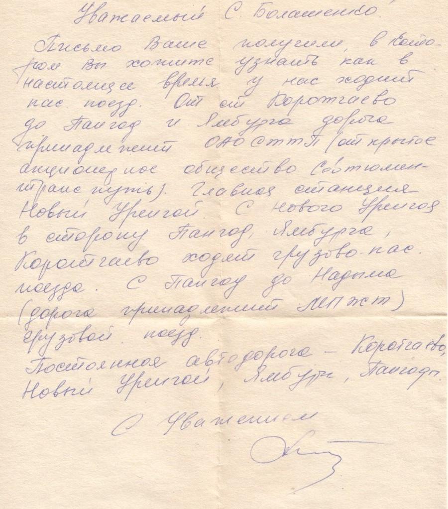 Пиcьмо от начальника станции Новый Уренгой, касающееся текущего состояния линий Новый Уренгой — Ямбург и Новый Уренгой — Пангоды — Надым, декабрь 1997 года