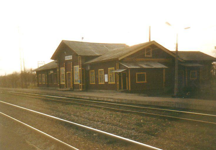 Gare principale dans la ville de Rochal (région de Moscou). Le propriétaire de ce chemin de fer (entre Rochal et Tchérousti) est l'usine chimique de Rochal. Depuis 1996, le service voyageurs fut supprimé, mais il éxiste lа un faible trafic fret. Aoщt 2000.