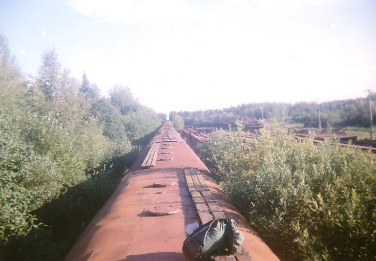 Chemin de fer industriel déstiné aux transportations du bois, entre Kazarinovo et Gagarino (Russie, régions de Yaroslavl et de Kostroma). Cette ligne est abandonnée depuis l'année 1998. Les deux premiers kilomиtres sont utilisés pour le stationnement des wagons qui sont aujourd'hui "superflus" sur les grandes lignes... Vue prise du toit de cette grande rame. Aoщt 2000.