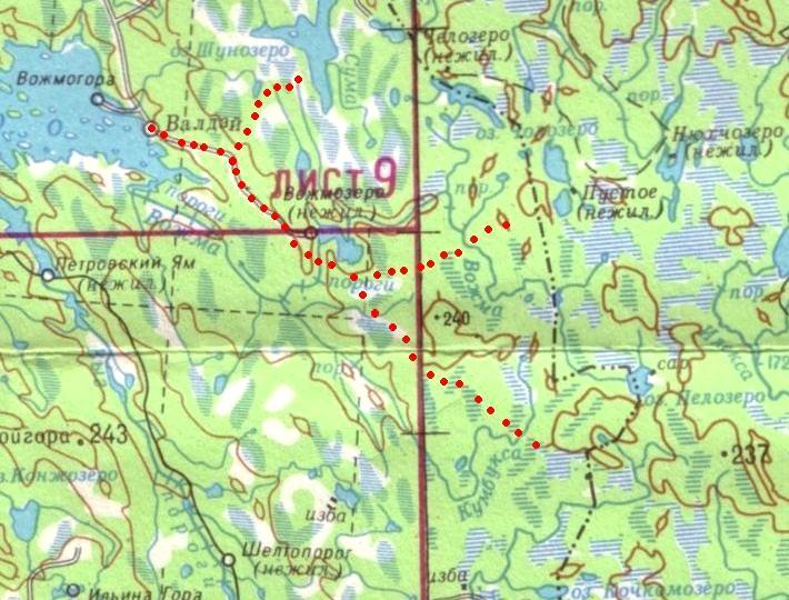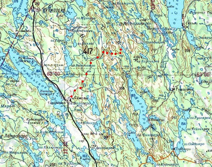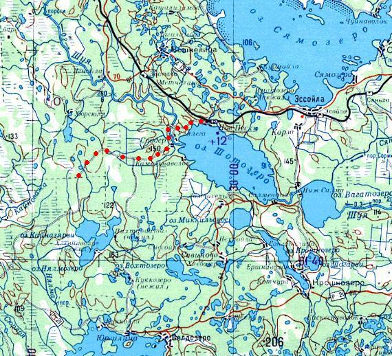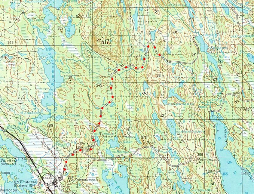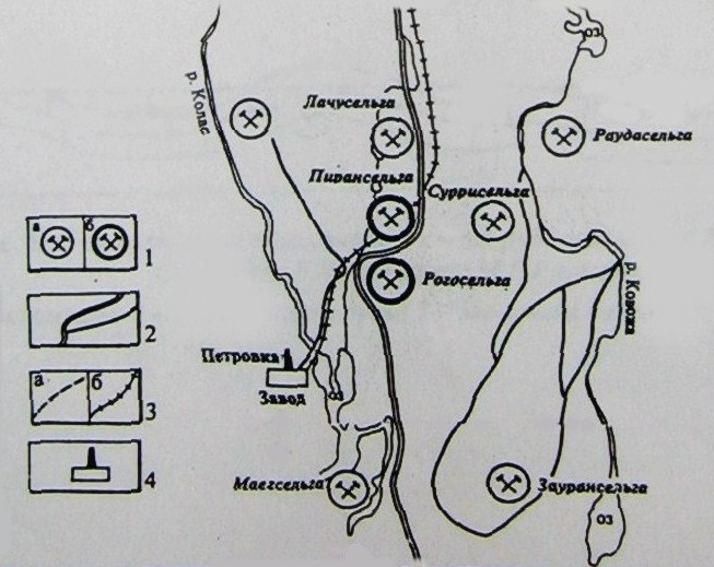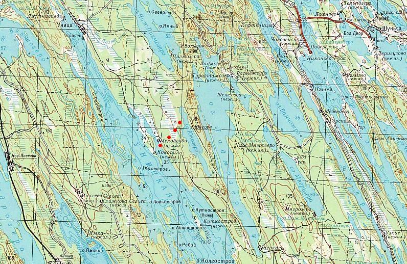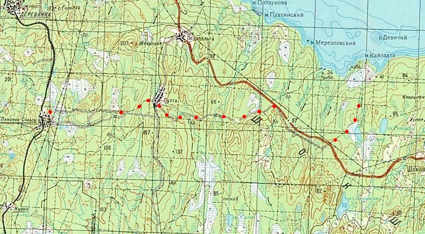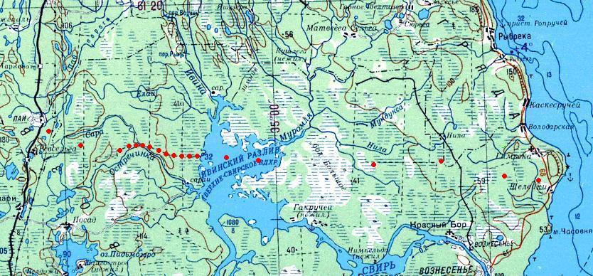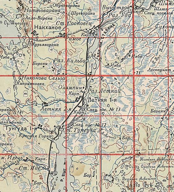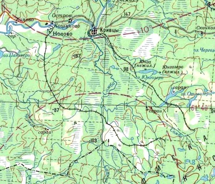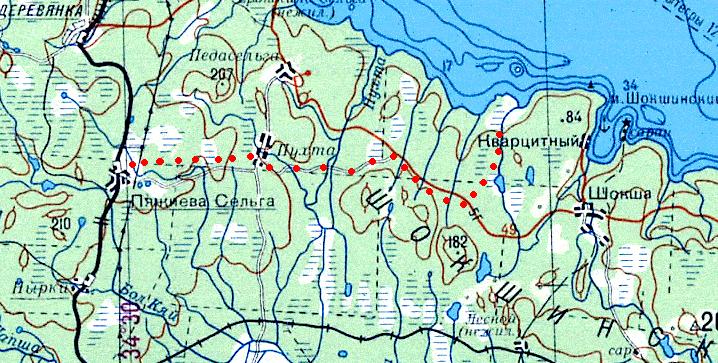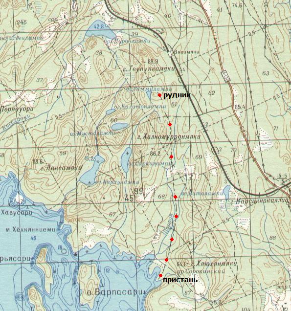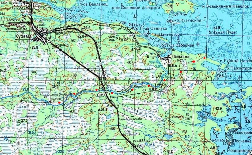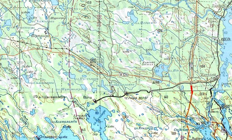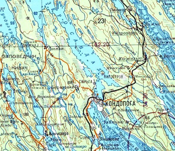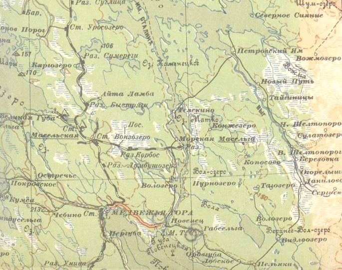 Кондопожская (?) узкоколейная железная дорога. Начальный пункт — город Кондопога, расположенный вблизи станции Кондопога на железнодорожной линии Петрозаводск — Кочкома.