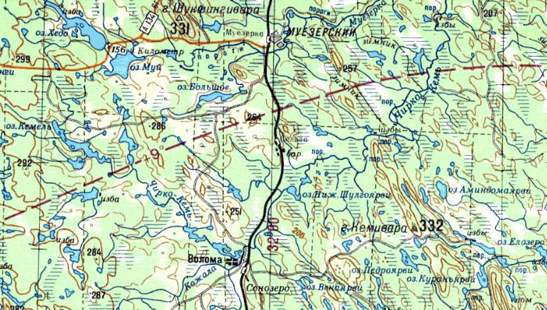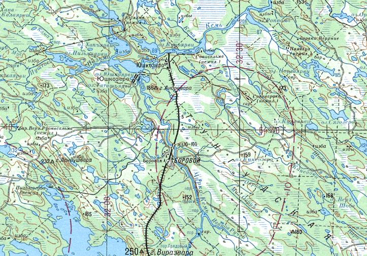 масштаба 1:500 000, изданной в 1987 году. Узкоколейная железная дорога принадлежала Юшкозерскому леспромхозу. Предполагаемый начальный пункт — посёлок Боровой. Узкоколейная железная дорога действовала в 1950-1960-х годах.