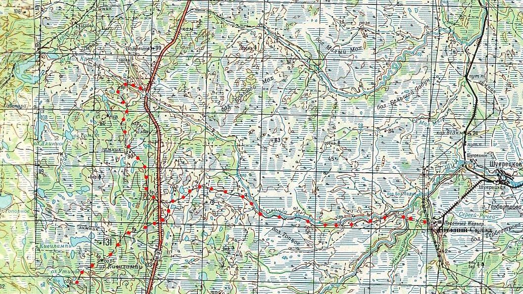 Юшкозерская узкоколейная железная дорога. Предполагаемый начальный пункт — посёлок Боровой, расположенный вблизи станции Боровая на железнодорожной линии Ледмозеро — Юшкозеро.