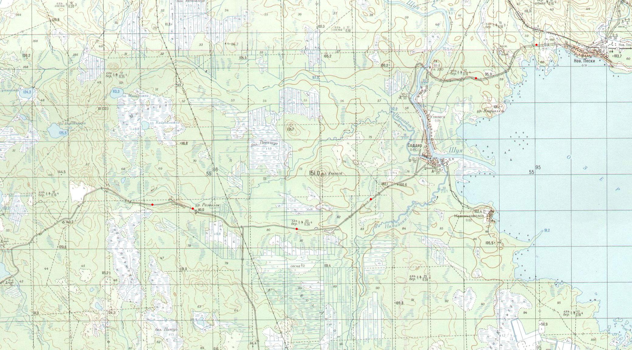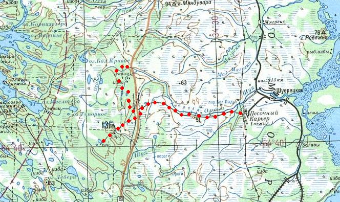 Шуерецкая (?) узкоколейная железная дорога. Начальный пункт — посёлок Песочный Карьер, связанный подъездным путём широкой колеи со станцией Шуерецкая на железнодорожной линии Беломорск — Ручьи-Карельские.