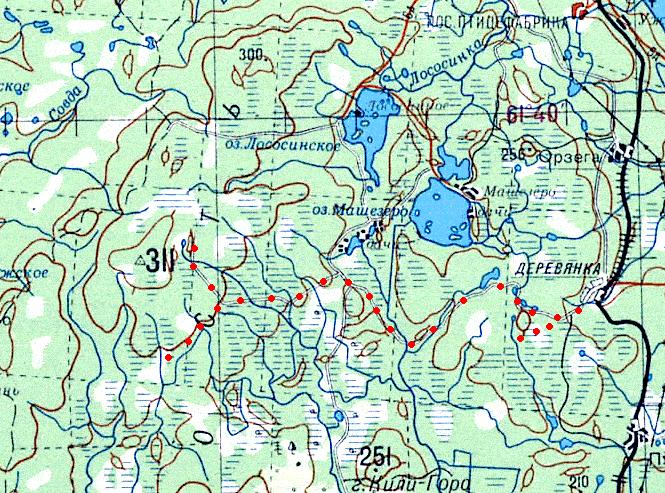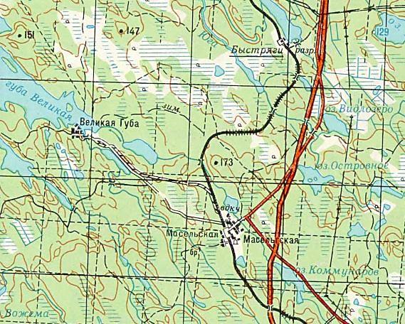 Узкоколейная железная дорога (?) в окрестностях станции Масельская. Возможный начальный пункт — станция Масельская, расположенная на железнодорожной линии Петрозаводск — Кочкома.
