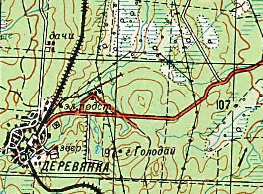 Район местонахождения узкоколейной железной дороги на топографической