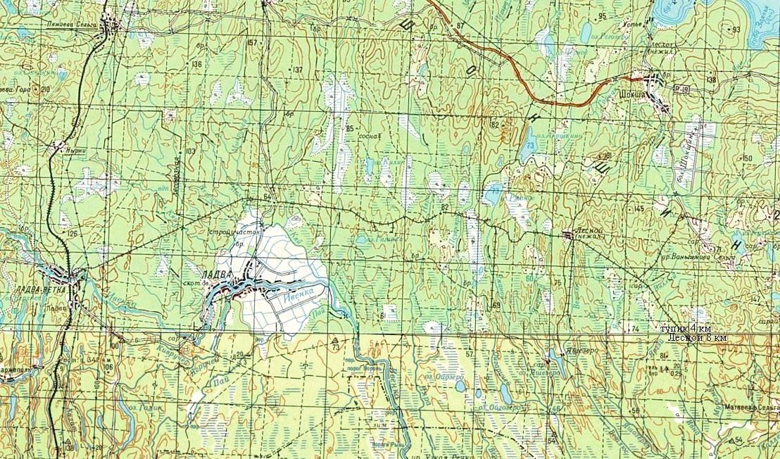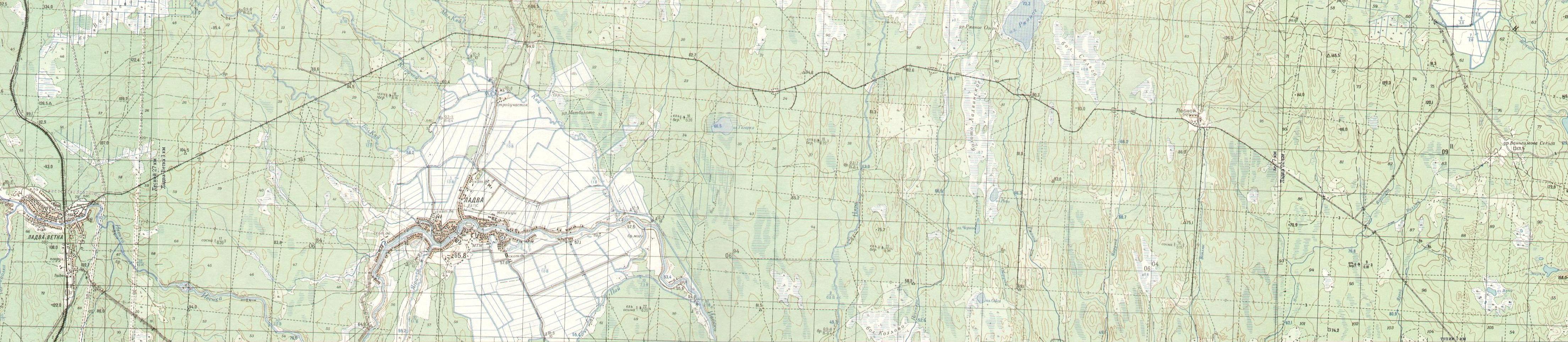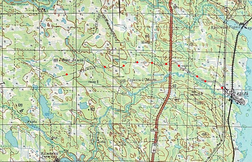 Район местонахождения узкоколейной железной дороги на топографической карте масштаба 1:100 000,