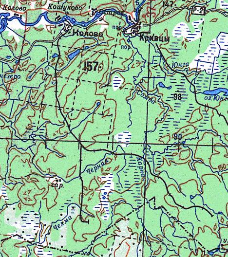 Район местонахождения узкоколейной железной дороги на топографической карте масштаба 1:500 000,