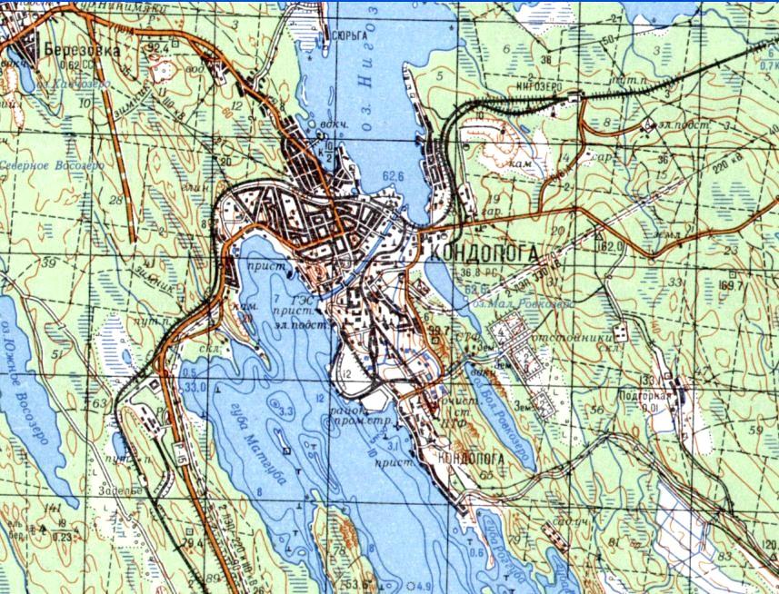 масштаба 1:100 000, изданной в 1994 году. Кондопожский целлюлозно-бумажный комбинат является главным предприятием города Кондопога. Строительство комбината началось в 1923 году. Одновременно началось строительство Кондопожской ГЭС, расположенной в непосредственной близости от места строительства целлюлозно-бумажного комбината.