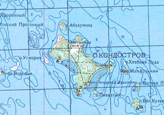 масштаба 1:200 000, изданной в 1983 году. По информации от исследователя железных дорог из Финляндии Юкки Нурминена (Jukka Nurminen), в 1923 году на острове Кондостров была построена узкоколейная железная дорога (либо рельсовый путь узкой колеи, на котором не применялась локомотивная тяга). Узкоколейная железная дорога (рельсовый путь узкой колеи) использовалась (использовался) для доставки камня от мест добычи (каменоломен) до пристани. Узкоколейная железная дорога (рельсовый путь узкой колеи) находилась в ведении железнодорожной структуры Соловецкого лагеря особого назначения, позднее в ведении одной из структур в составе ГУЛЖДС (Главного управления лагерей железнодорожного строительства).
