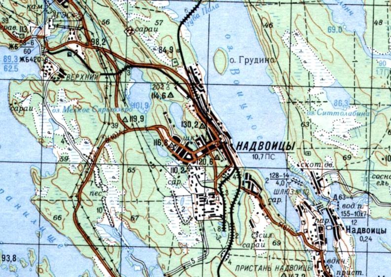 изданной в 1985 году (узкоколейная железная дорога не обозначена). Надвоицкий алюминиевый завод является главным предприятием посёлка Надвоицы. Завод работает с 1954 года.