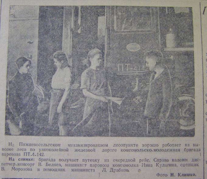Меня направили в этот лесопункт для укрепления старшим механиком, а затем года через полтора назначили начальником Кучезерского лесопункта Кировского ЛПХ. Внедряли мы в организацию производственного процесса всё по тем временам передовое, новое. К примеру, хлыстовую вывозку. Даже ночью вели валку леса, ведь заготавливать надо было довольно много — 220 тысяч кубов в год. Пришлось изучить на месте и тракторное, и автомобильное дело. Не отказывались и от конной тяги. Да ещё и лошадками вывозили лес.