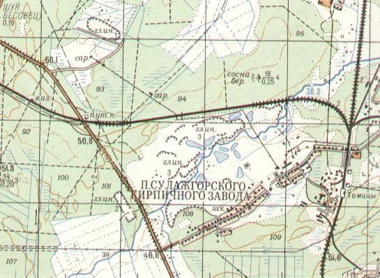 изданной в 1988 году (нанесена условно). Узкоколейная железная дорога на топографической карте масштаба 1:50 000, изданной в 1989 году (нанесена условно)