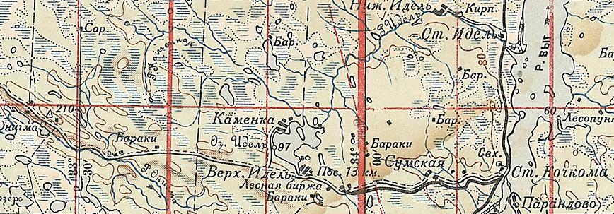 Возможная трасса узкоколейной железной дороги на топографической карте масштаба 1:200 000, изданной в 1994 году. По неподтверждённым данным, узкоколейная железная дорога пролегала от станции Идель в западном направлении. Узкоколейная железная дорога (в случае, если она когда-либо существовала) относилась к категории лесовозных.