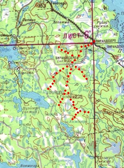 Вирандозерская узкоколейная железная дорога. Начальный пункт — посёлок Вирандозеро, расположенный вблизи станции Вирандозеро на железнодорожной линии Обозерская — Беломорск.