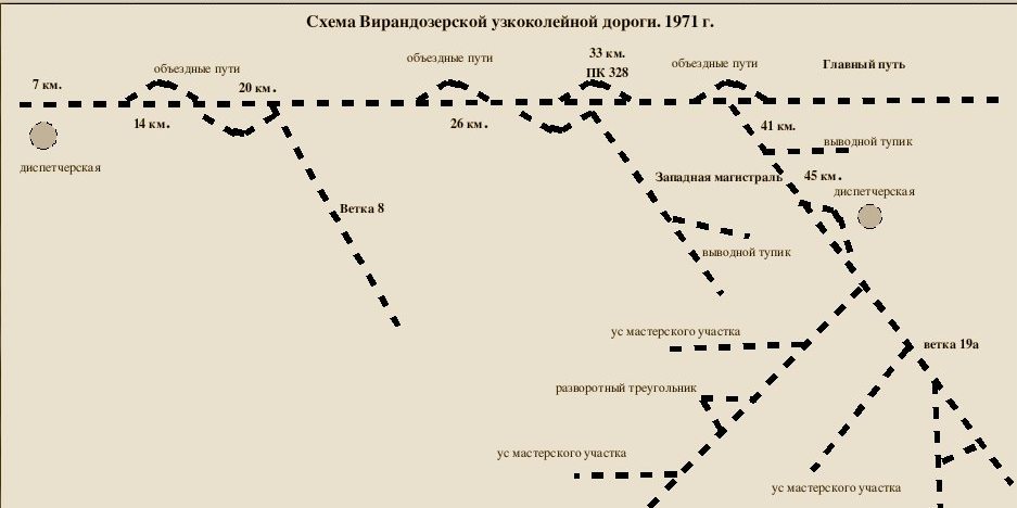 Схема Вирандозерской узкоколейной железной дороги, 1971 год (Источник)