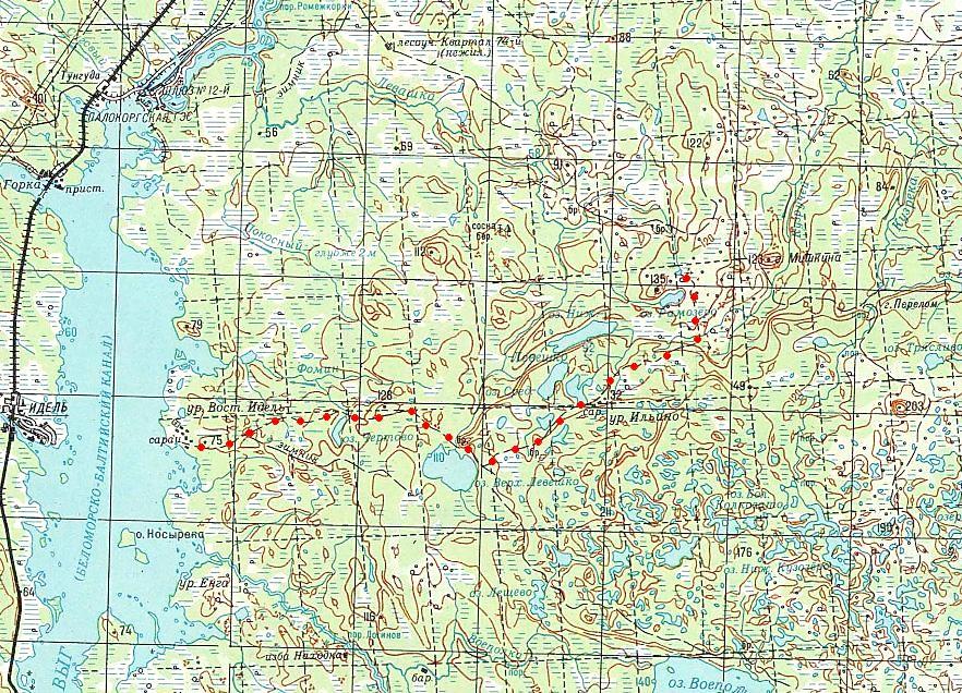 изданной в 1994 году (нанесена условно). Начальным пунктом Восточно-Идельской узкоколейной железной дороги являлся посёлок Восточный Идель, расположенный в окрестностях станции Идель на железнодорожной линии Кочкома — Беломорск, на противоположном (восточном) берегу водохранилища реки Выг (Беломорско-Балтийского канала). Узкоколейная железная дорога была лесовозной, «сплавной».