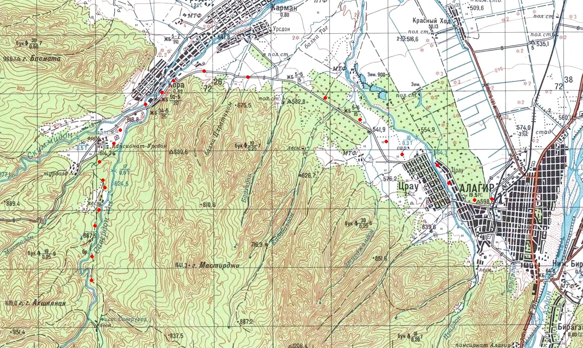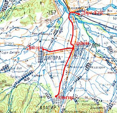на топографической карте масштаба 1:500 000. По неподтверждённым данным, узкоколейная железная дорога Дарг-Кох — Алагир была построена в 1920-х годах. Возможно, имелось ответвление от станции Ардон до станции Дигора, узкоколейная железная дорога составляла единую сеть с лесовозной узкоколейной железной дорогой в районе Алагира.