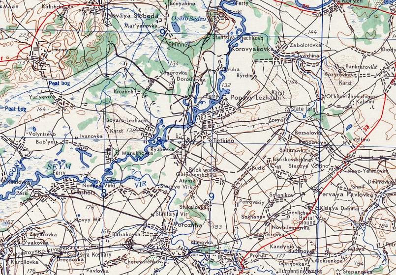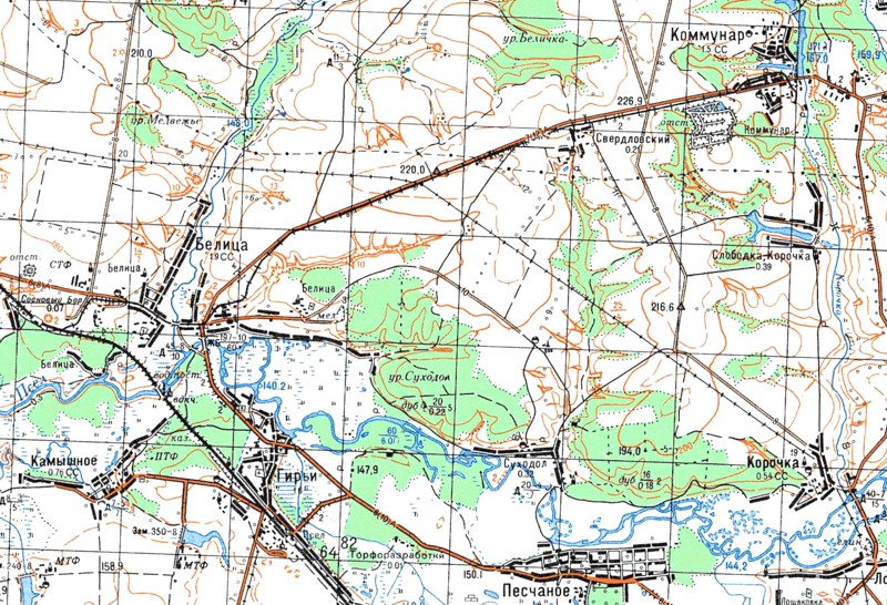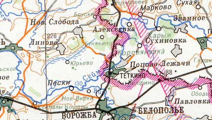 Узкоколейная железная дорога на топографической карте масштаба 1:100 000, изданной в 1984 году. Главная линия узкоколейной железной дороги пролегала по направлению сахарный завод «Коммунар» — станция Сосновый Бор на железнодорожной линии Льгов — Готня.