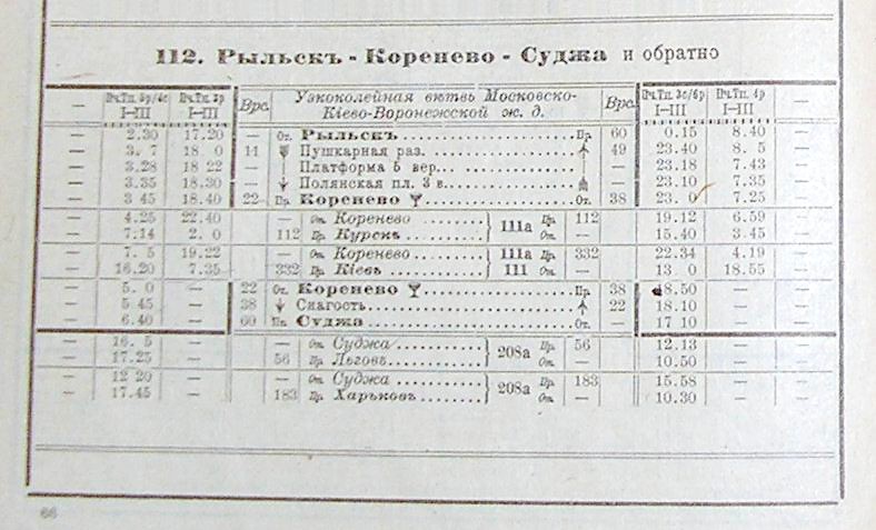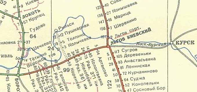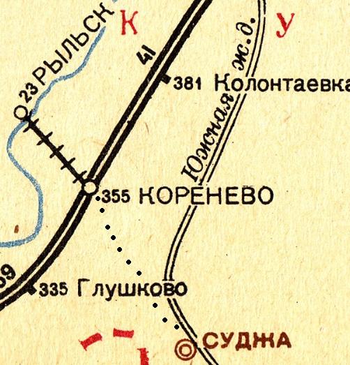 Узкоколейная железная дорога Суджа — Коренево — Рыльск. Начальный пункт — станция Суджа, расположенная на железнодорожной линии Льгов — Готня.