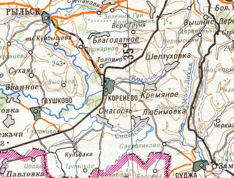 В 1960-х годах по направлению Коренево — Рыльск была построена железнодорожная линия широкой колеи.