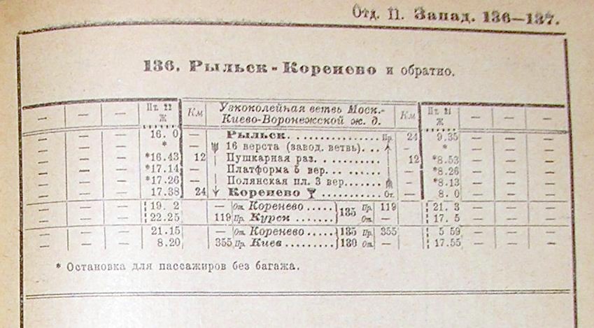 железнодорожных и других пассажирских сообщений», изданного НКПС СССР). По информации от Л. Москалёва (автора книги «Наши узкоколейные паровозы»), первый участок узкоколейной железной дороги, от станции Суджа до станции Коренево, был открыт «для правильного движения» в ноябре 1893 года. Его протяжённость составляла 39 километров, ширина колеи — 1000 мм. В апреле 1894 года был открыт «для правильного движения» участок Коренево — Рыльск, протяжённостью 23 километра.