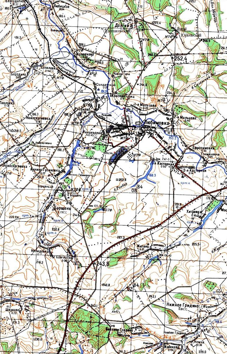 (нанесена условно, на основе данных предыдущей карты). Любимовский сахарный завод открыт в 1891 году. На протяжении длительного времени завод носил название «Коллективист». Завод был связан железной дорогой широкой колеи со станцией Блохино на магистральной железнодорожной линии Курск — Льгов (по состоянию на 2010 год, по неподтверждённым данным, железнодорожная линия Блохино — Любимовка разобрана).