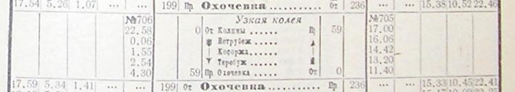 Расписание движения поездов на лето 1956 года (из «Официального указателя пассажирских сообщений»). Узкоколейная железная дорога была построена в конце 1890-х годов. Открытие узкоколейной железной дороги состоялось 13 сентября 1899 года.