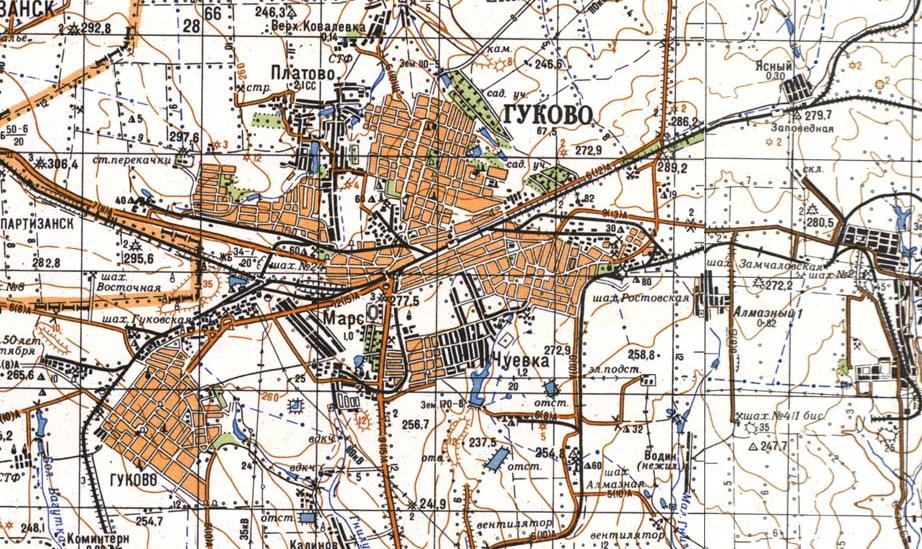 изданной в 1993 году (основная часть), 1982 году (восточная часть). В городе Гуково и его окрестностях действовали узкоколейные железные дороги, соединявшие станцию на железной дороге широкой колеи с угольными шахтами. На топографической карте масштаба 1:100 000, изданной в 1941 году, показана узкоколейная железная дорога длиной около 3 километров, пролегающая по направлению станция Гуково — шахта №20.