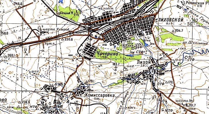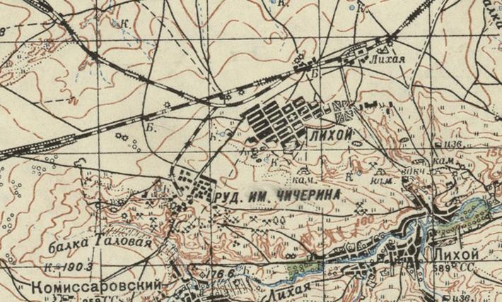 масштаба 1:100 000 (узкоколейная железная дорога не обозначена). На топографической карте масштаба 1:100 000, изданной в 1941 году, показана узкоколейная железная дорога длиной около 2 километров, пролегающая по направлению станция Лихая — рудник (шахта) имени Чичерина.