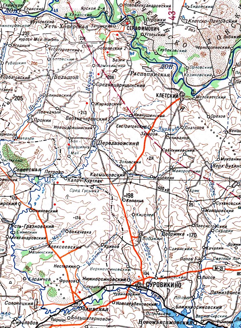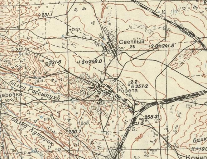 Узкоколейная железная дорога на топографической карте масштаба 1:1 000 000, изданной в 1991 году (нанесена условно). Узкоколейная железная дорога являлась военно-полевой. Узкоколейная железная дорога была построена в августе 1942 года для нужд германской армии в ходе наступления на Сталинград.