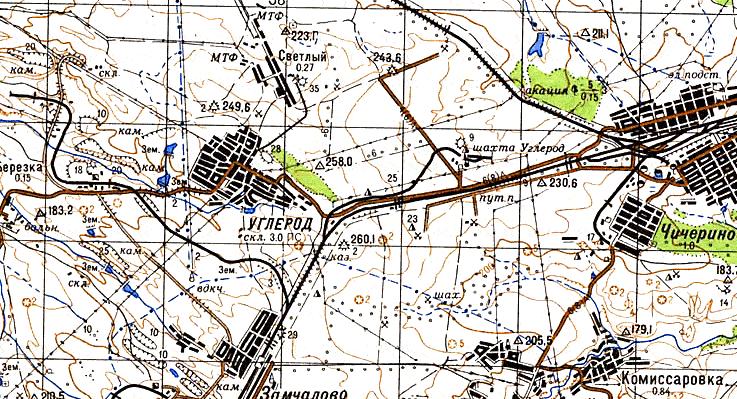 масштаба 1:100 000, изданной в 1982 году. В окрестностях посёлка Углерод действовала узкоколейная железная дорога, обслуживавшая угольную шахту, но имевшая необычно большую для шахтных узкоколейных железных дорог протяжённость наземного участка — почти 2 километра.