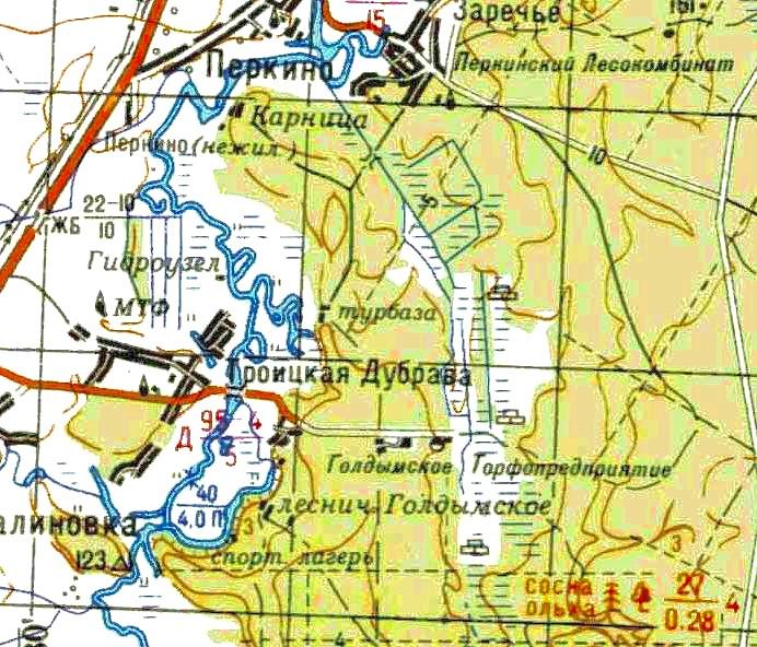 Район возможного местонахождения узкоколейной железной дороги на топографической карте. В посёлке Голдымского торфопредприятия находится торфобрикетный завод. Объём добычи торфа здесь достаточно велик.