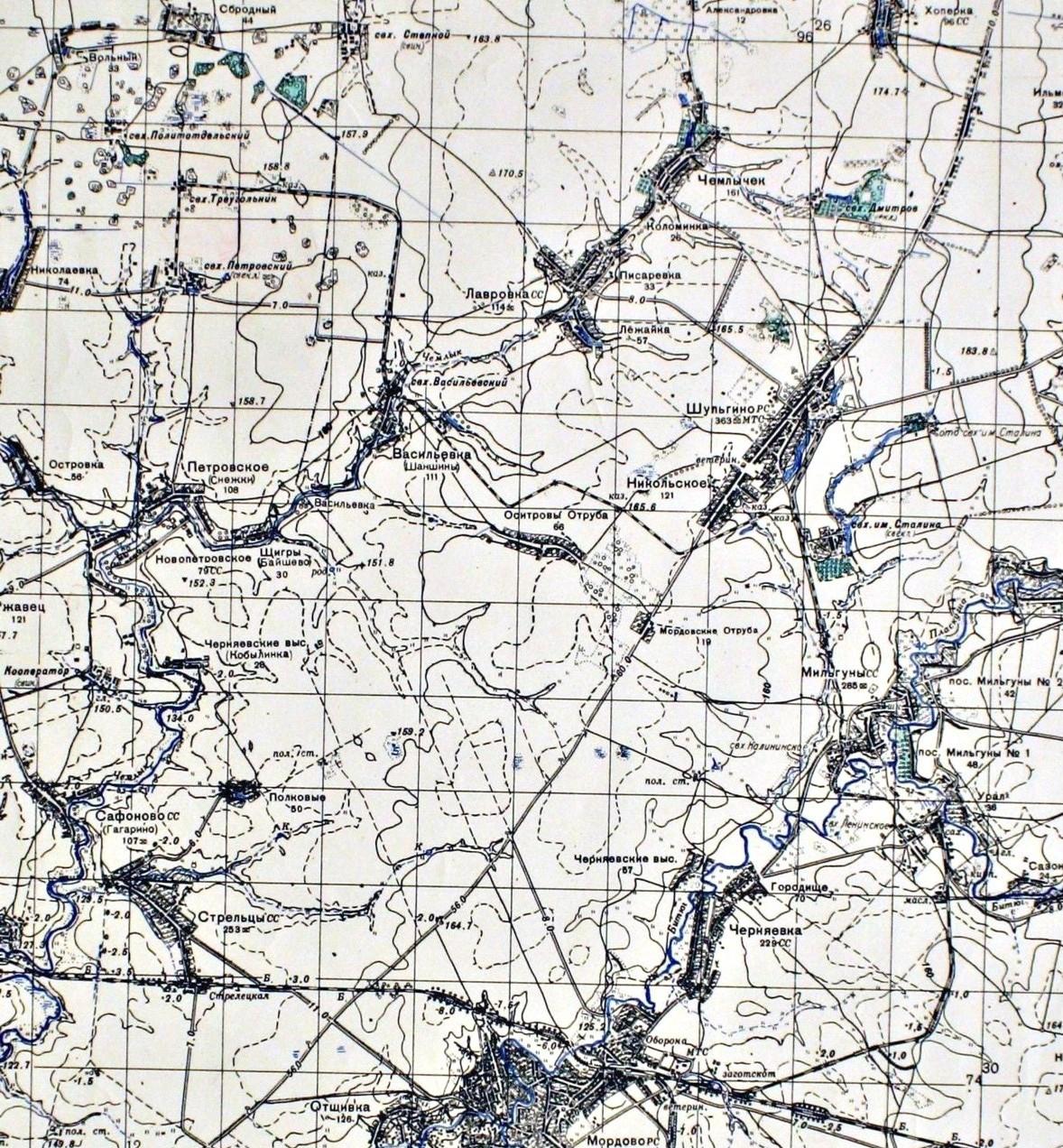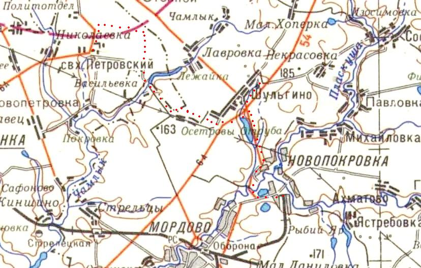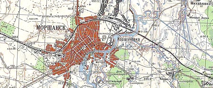 Узкоколейная железная дорога (?) на топографической карте масштаба 1:100 000. Возможно, узкоколейная железная дорога связывала станцию Коршуновка с одним из промышленных предприятий города Моршанска. Не исключено, что обозначение на карте является ошибкой картографов, в действительности по трассе узкоколейной железной дороги пролегал (пролегает) подъездной путь широкой колеи.