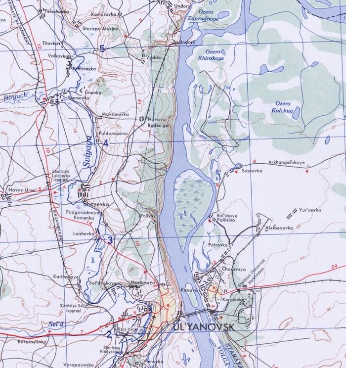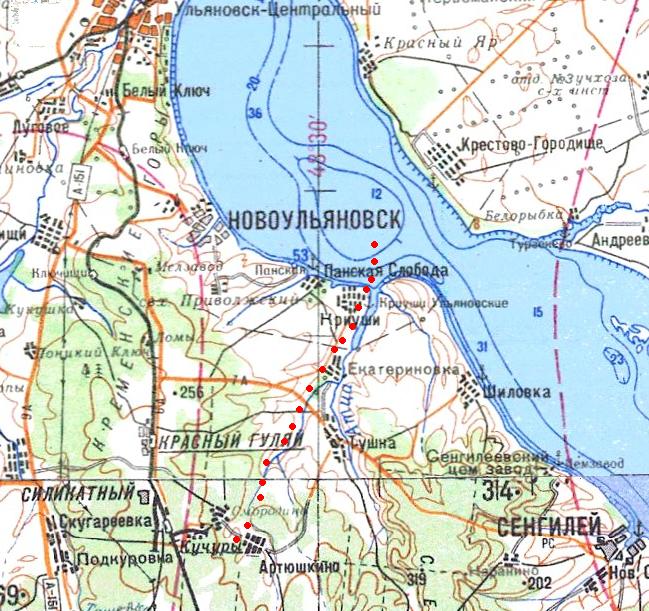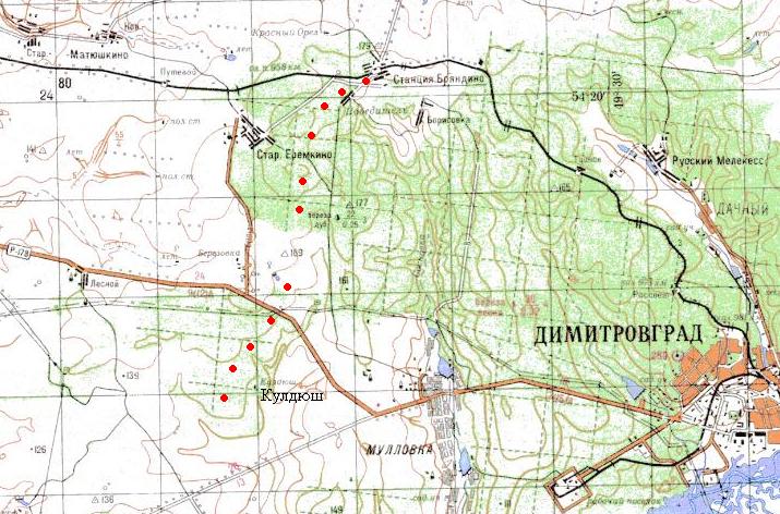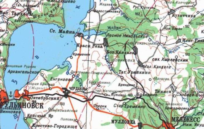 Узкоколейная железная дорога (?) Димитровградского кирпичного завода. Возможный начальный пункт — город Димитровград, расположенный у станции Димитровград на железнодорожной линии Ульяновск — Акбаш.