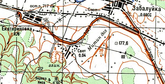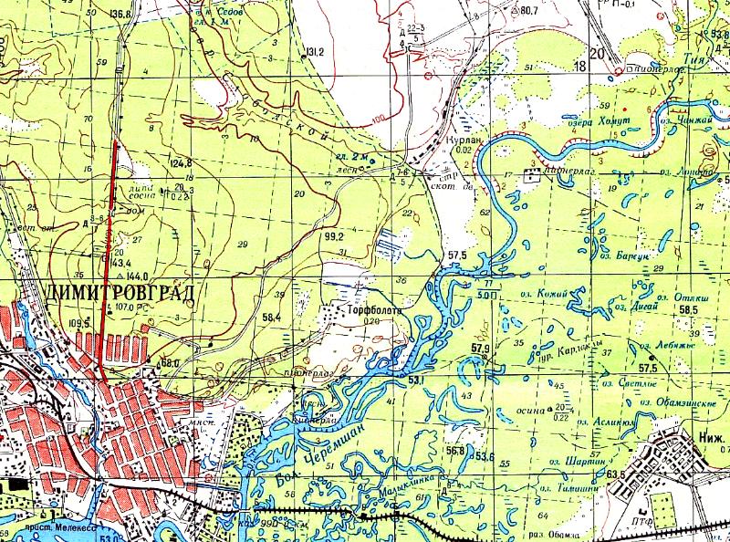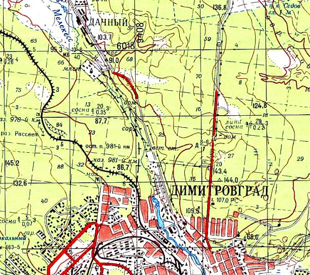 масштаба 1:100 000, изданной в 1987 году. На топографической карте масштаба 1:100 000 (в 1 сантиметре — 1 километр), изданной в 1987 году, обозначена строящаяся узкоколейная железная дорога, пролегающая по направлению Димитровград — Дачный.