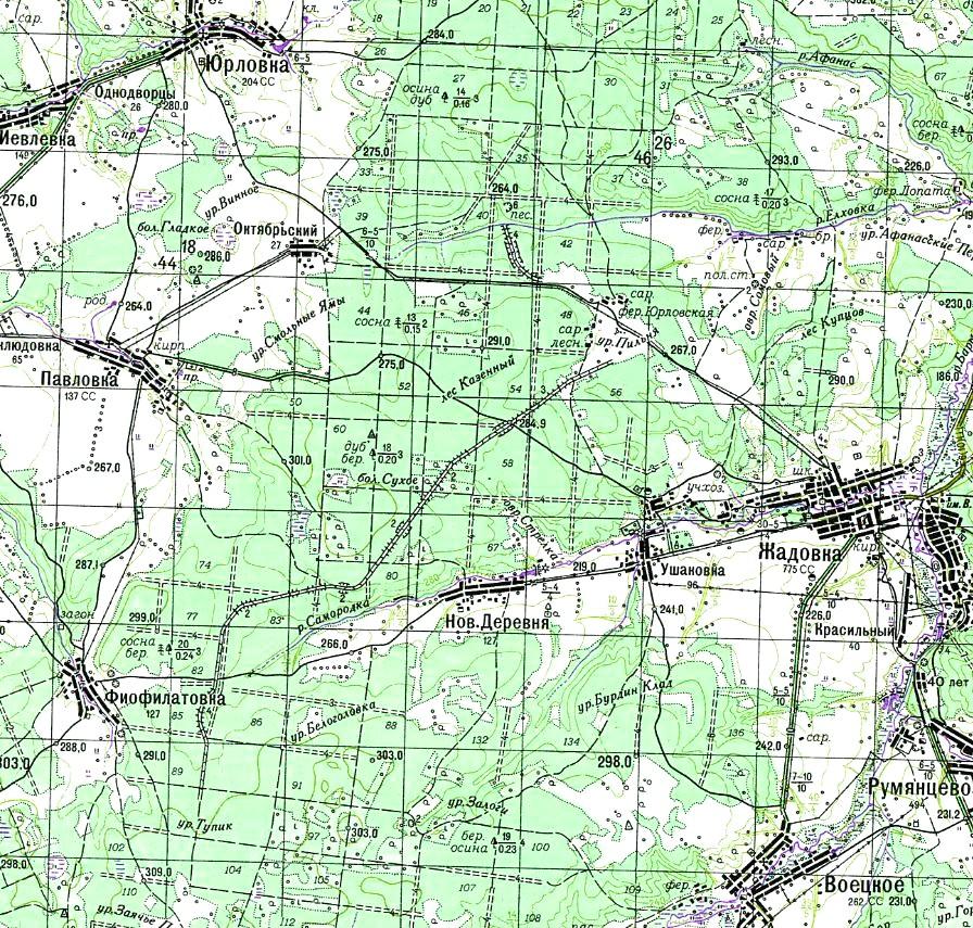 Район местонахождения узкоколейной железной дороги на топографической карте масштаба 1:100 000,