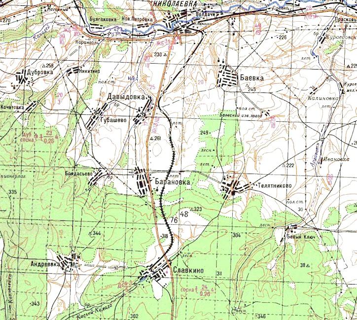 Разобранная узкоколейная (?) железная дорога на топографической карте масштаба 1:100 000,